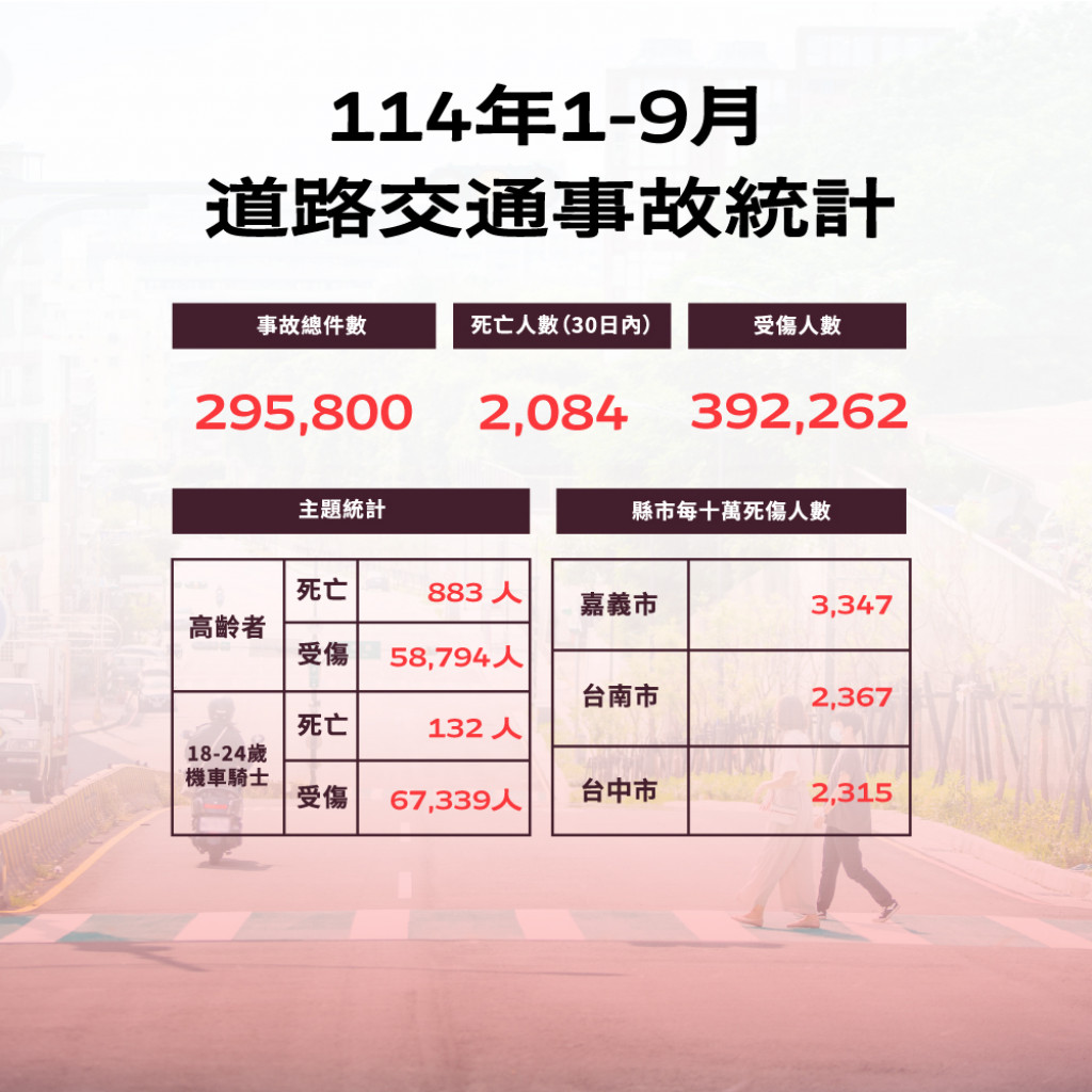 - 本縣114年1-9月道路交通事故死傷累計23,418人,協助加強宣導,共同降低死傷人數,請查照。