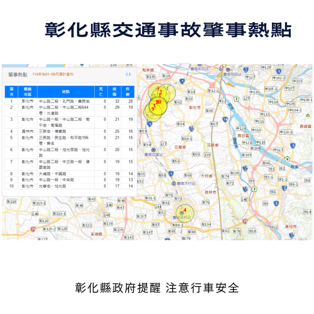 - 根據交通部道安資訊查詢網,本縣114年1-9月道路交通事故與112年同期比較分析,以少年自行車騎士(含電自、電輔) 事故增加45%最高,外籍人士事故增加34.3%次之,自小客車駕駛人增加26%再次之。1-9月份鄉鎮市30日死亡人數於「彰化市、員林市、二林鎮」為多,肇事熱點以「彰化市」為多,合先敘明。